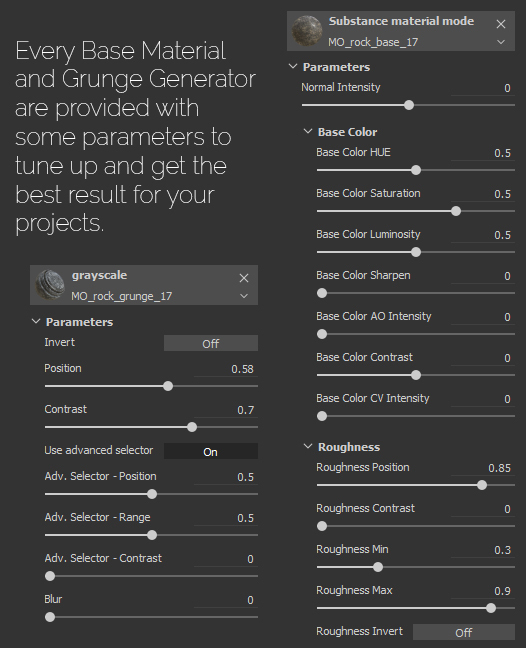 Every Base Material and Grunge Generator are provided with some parameters to tune up and get the best result for your projects.